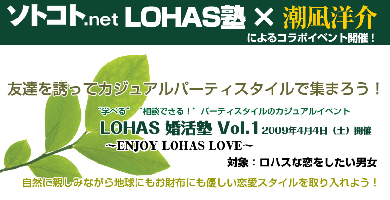当イベントは、ロハス雑誌「ソトコト」とのコラボレーションにより開催! まったくあたらしいLOHASなLOVE STYLE&婚活スタイルを恋愛エッセイスト潮凪洋介がレクチャーします。 そして和気あいあいのパーティタイムもお楽しみください。 LOHAS LOVEアイデアの発表会や恋愛相談なども目白押し!名刺をご持参でお気軽に参加ください。御愉しみに!無料恋愛相談も先着順でやります!みんなお友達になりましょう〜♪?【ロハス婚活塾の詳細&お申し込みはこちら】